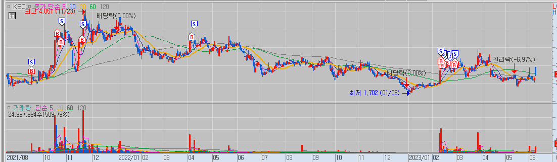 이번 포스팅에서는 KEC 주가 전망을 제가 한번 해보겠습니다. KEC는 약간 제 자랑입니다만 제가 좀 단타로 좀 많이 수익을 좀 냈었네요. 포스팅용으로 쓰는 차트는 이런 키움의 자동일지 매매 차트를 많이 쓰는데 보니까 예전에 단타로 좀 많이 수익을 냈었네요. 그 이후에는 좀 제가 관심을 안 뒀습니다만 워낙 많은 종목을 다루다 보니까 계속 봐야 되는데 이렇게 못 보는 경우도 발생합니다.